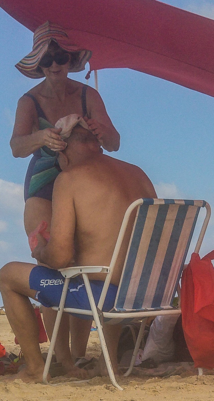 Она заботливо натирает его кремом от загара. Набирает в ладонь мазь и трет, трет. Мужчина терпит, терпит, но молчит, правда вздыхает и с тоской смотрит на манящее свободой море.