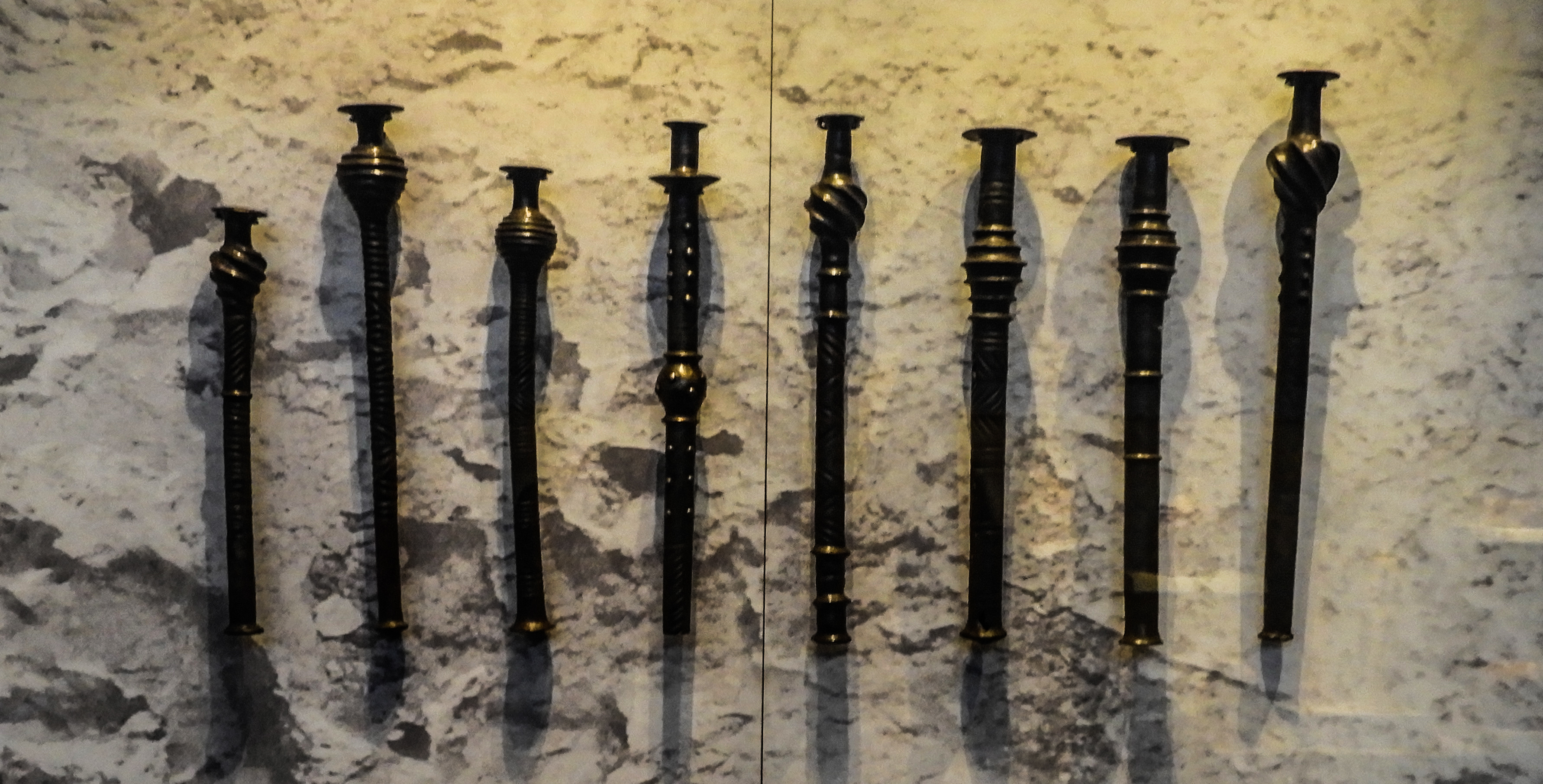 Длинную цельнолитую цилиндрическую втулку с рельефной сложной поверхностью имеют многие жезлы и навершия (диаметром от 3 до 6 см, весом от 110 до 619 г), некоторые из них являются настоящим произведением искусства.