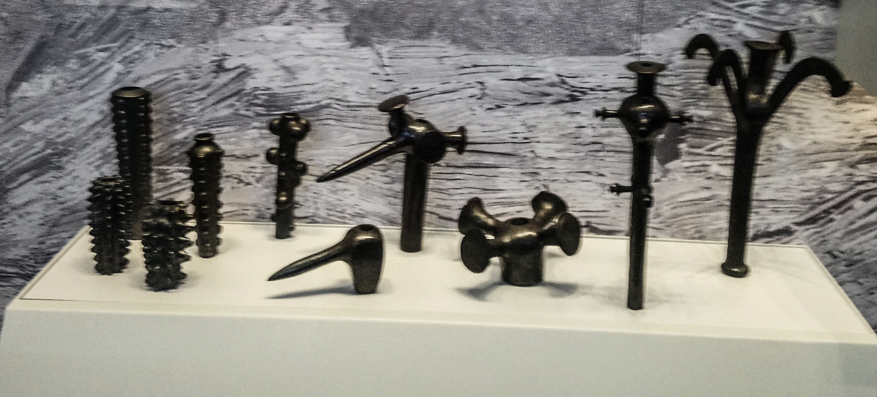 Некоторые экземпляры были подвергнуты структурному исследованию. Оказалось, что среди них есть тонкостенные, внутри которых остатки керамических или каменных сердечников,залитых снаружи металлом, у некоторых на поверхности остались фрагменты литейных форм. Похоже, что именно тонкостенные предметы носили символический характер.