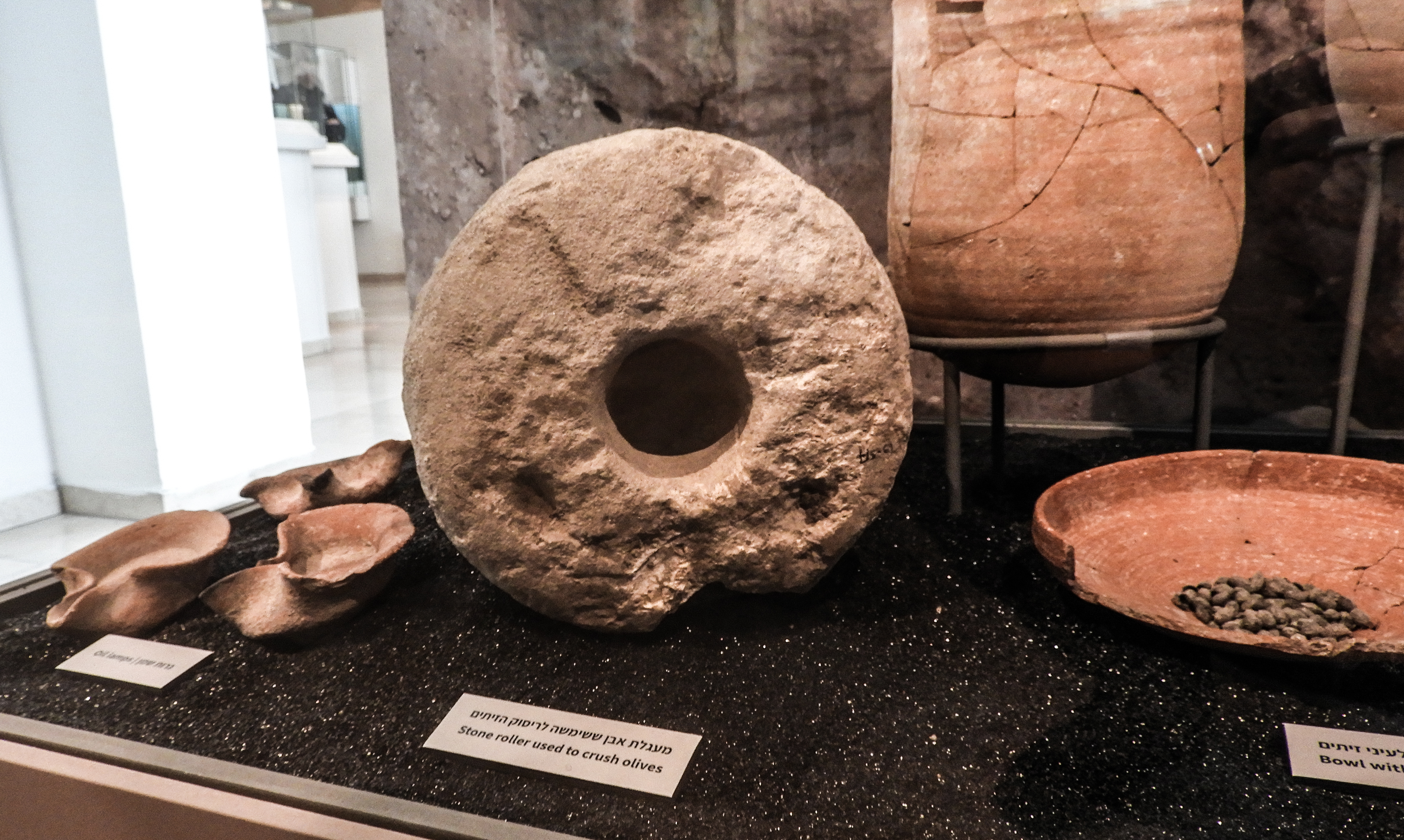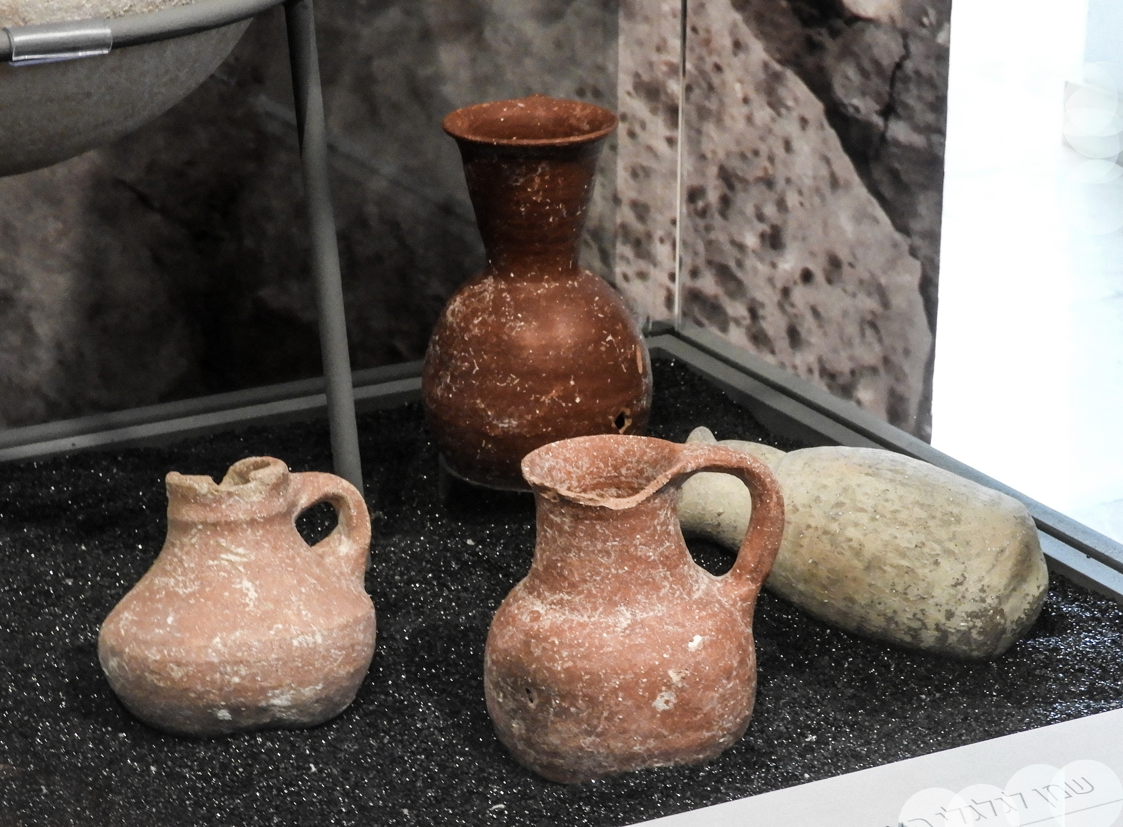 Фото Рами Юдовина: Керамика, каменный пресс для растирания маслин, косточки маслин, емкость для оливкового масла из иудейского Бейт Шемеша