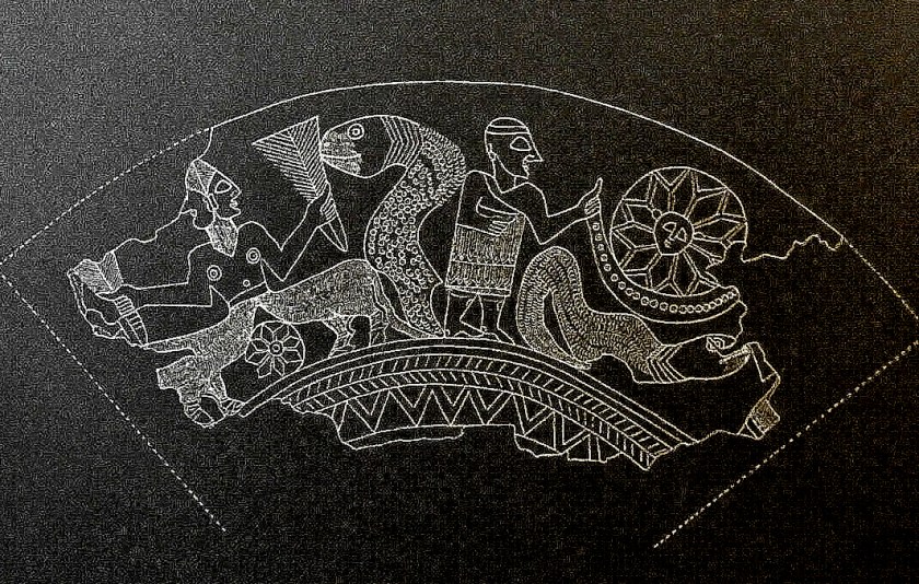 Первая сцена запечатлела двух, симметричных по отношению друг к другу существ (вторая фигура практически не сохранилась). Они держат предмет в форме полумесяца, украшенный кружочками, над которым расположен круг, а в нём можно разглядеть человеческое лицо, обрамлённое двенадцатью лепестками, вероятно это изображение розетты (орнаментальный мотив в виде распустившегося цветка с одинаковыми лепестками) или звезды, солнца.