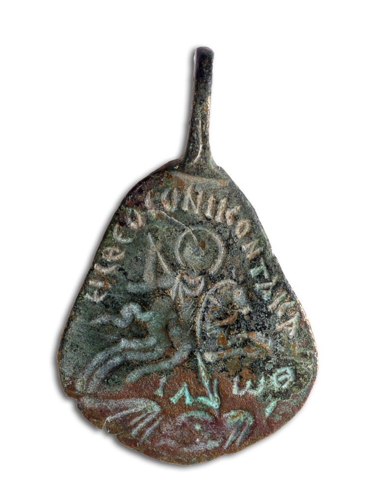 Первым делом, видя изображение всадника с нимбом над головой, убивающего копьём демона, вспоминаешь одного из самых почитаемых христианских святых — Георгия Каппадокийца, прозванного Победоносцем, по преданию жившего в конце третьего – начале четвертого веков. Кстати, годы жизни святого бойца совпадают с датировкой амулета.