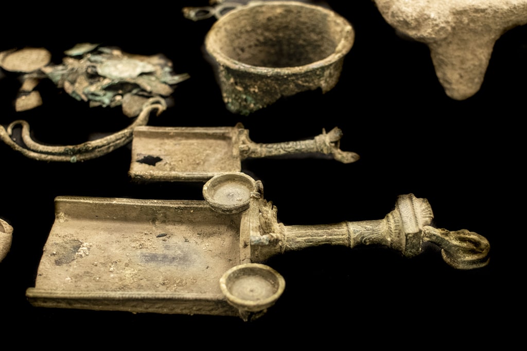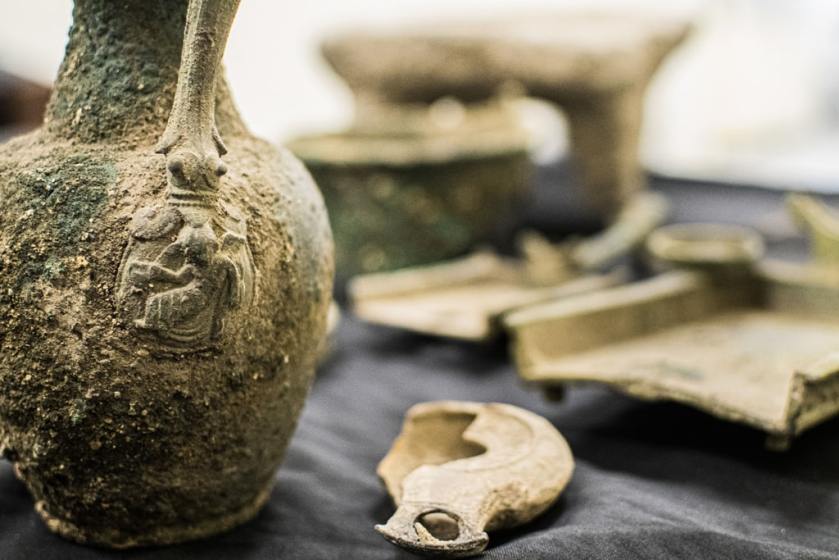 Среди предметов находился бронзовый кувшин для вина. На сосуде изображена сцена римского пира — возлежащий мужчина с кувшином вина в руке. Также декоративная каменная чаша-треножник, римские глиняные лампадки и сотни монет, датируемые поздним римским периодом (II – III вв. н.э.).