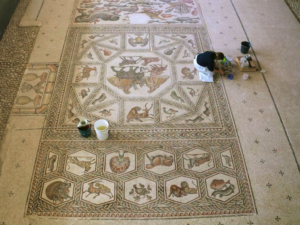 После повторного раскрытия мозаика она была укреплена на прочном, но легком основании с целью транспортировки.