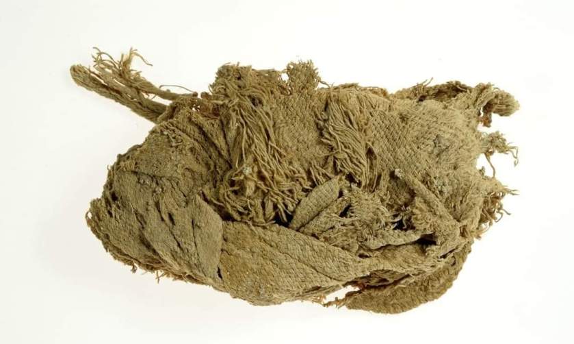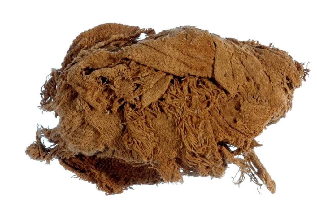 Был найден хорошо сохранившийся фрагмент савана (12 см на 16 см), который завязали узлом на правом плече умершего.