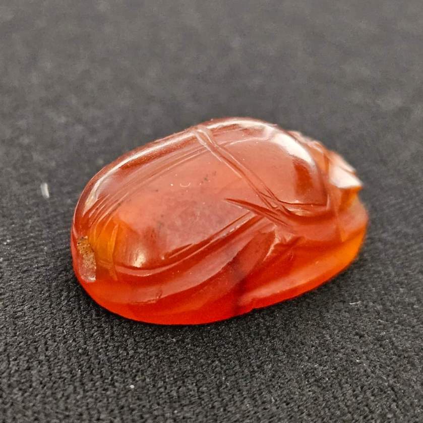 На камешке, оказавшемся сердоликом, похоже, изображен грифон, хотя более всего фигура напоминает мчащегося галопом крылатого коня. В древнем Египте печати в виде скарабеев были символом власти и отличительной чертой высшего сословия.