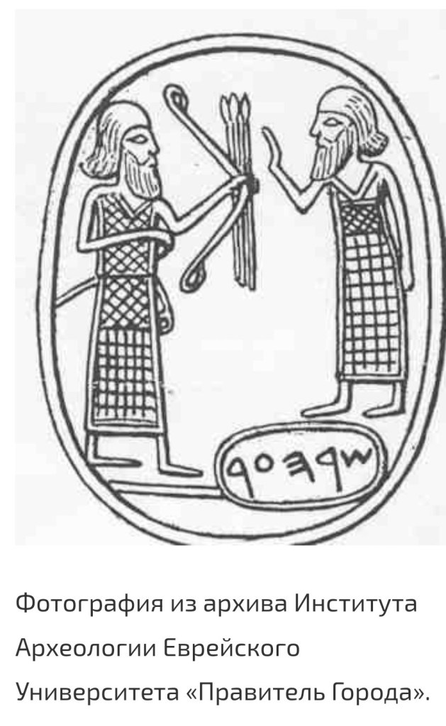 Булла с оттиском печати на иврите из Иудеи, VIII в. до н. э. Надпись гласит (сар hа-ир) — «Правитель Города» (Иерусалима). На печати – двое мужчин, носящие волосы по плечи и длинные бороды, одетые в мантии. Возможно, на этой булле изображён царь Иудеи, протягивающий правителю города знак власти, полномочий – лук и стрелы.