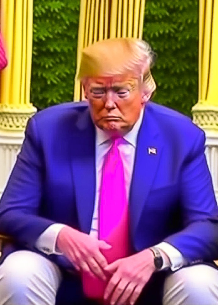 Трамп: — А как вы хотели? Утром назвать Путина «убийцей», а вечером с ним выпивать по зуму? Я всегда на стороне США и американского пипла (встаёт, прикладывает руку к сердцу, прислушивается, садится). Мой харт хочет пис во всем ворде. Ферштейн, Володя? Так что не надо своего тезку форшмачить. Я могу быть очень-очень жестоким, ведь за мной армия и флот самой великой державы. Но я, битч, добрый, я, битч, очень-очень добрый.